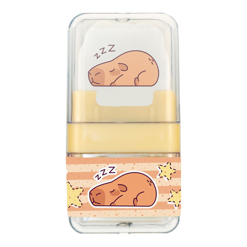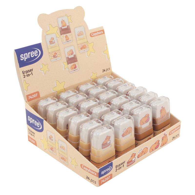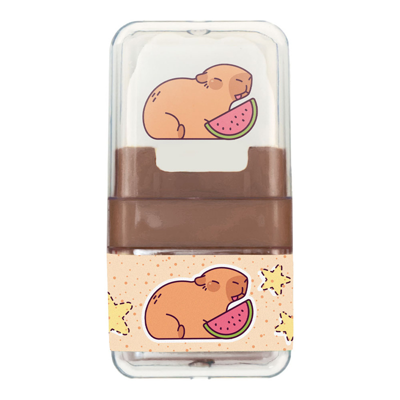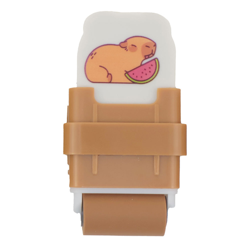 Gumka do wymazywania z motywem kapibary, wyposażona w rolkę do zbierania ścinków. Gumka jest miękka i z łatwością usuwa grafit bez rozmazywania. Rolka znajdująca się po drugiej stronie, służy do usuwania ścinków po gumowaniu. Gumka idealnie mieści się w szkolnym piórniku.