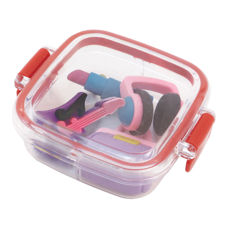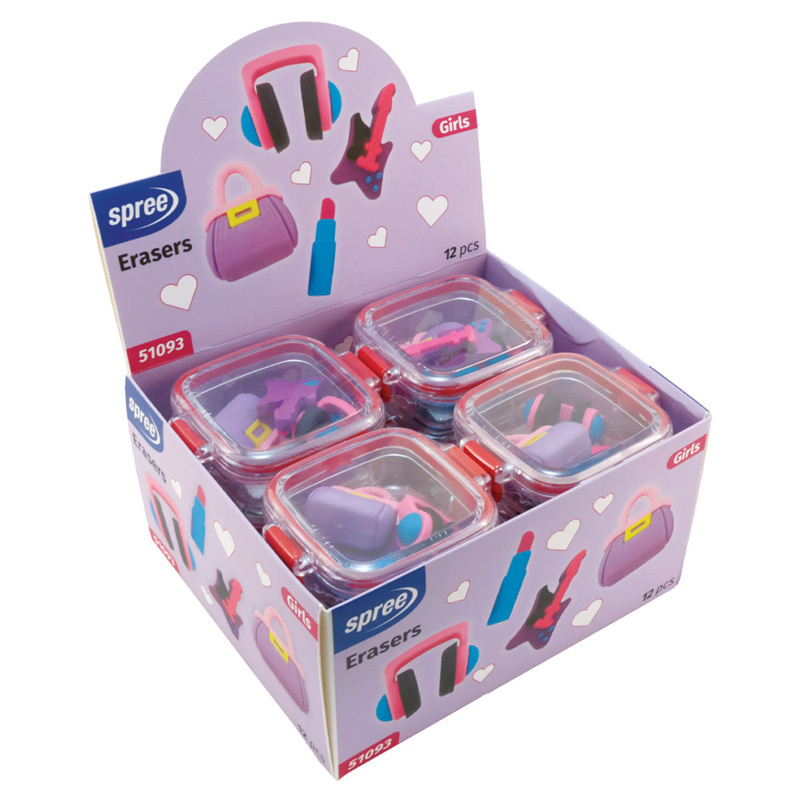 Zestaw gumek do wymazywania przeznaczony dla dziewczynek, zawierający gumki o atrakcyjnych kształtach inspirowanych akcesoriami i przedmiotami codziennego użytku, takimi jak szminka, torebka, słuchawki czy gitara. Wykonane z miękkiego materiału, skutecznie usuwają ślady ołówka, nie uszkadzając przy tym powierzchni papieru. Idealne do codziennego użytku w szkole, na uczelni oraz w biurze. Całość zapakowana w praktyczne, plastikowe pudełko ułatwiające przechowywanie.