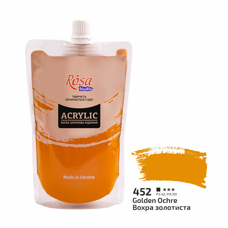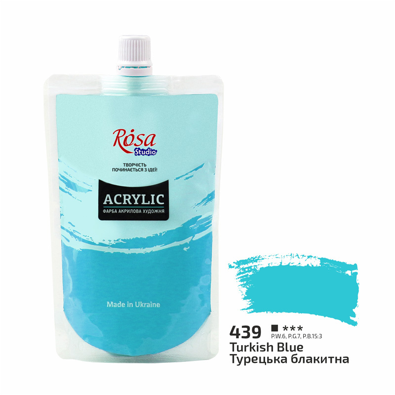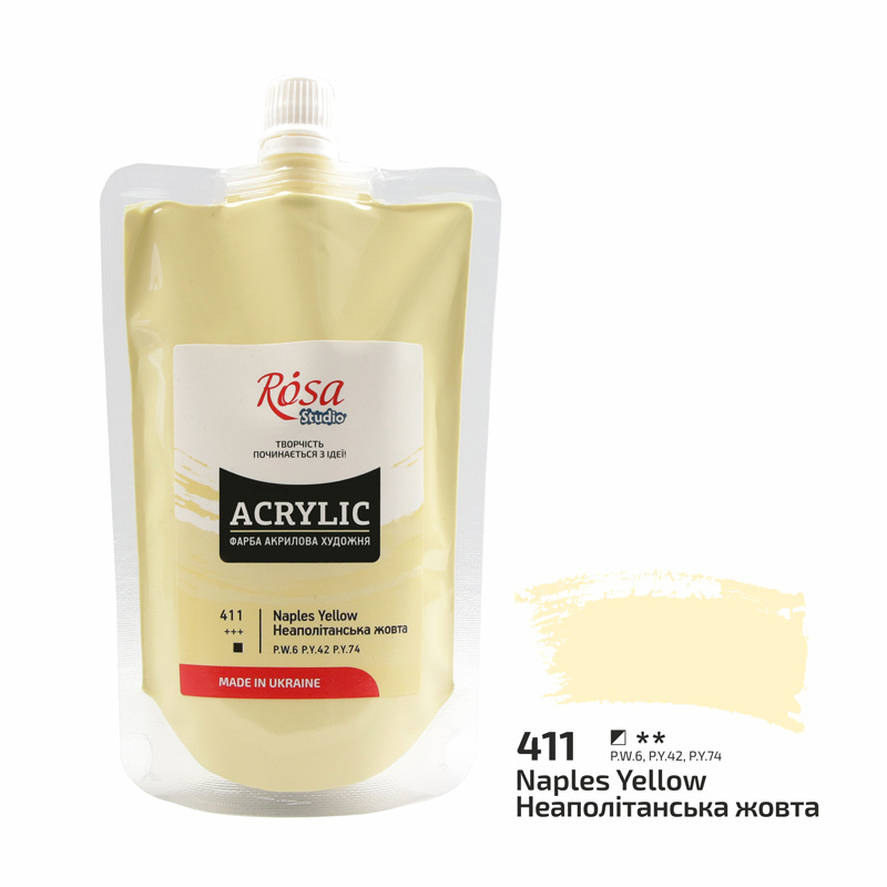 Farby akrylowe Rosa Studio w tubkach o pojemności 200 ml. Posiadają kremową, bardzo gęstą oraz jednolitą konsystencję, co ułatwia rozprowadzanie farb. Konsystencja farb jest jednorodna i niezależna od koloru; jest taka sama w całej palecie kolorystycznej. Farby cechują się niesamowicie wysoką pigmentacją i intensywnością kolorów. Bardzo dobrze rozprowadzają się na różnych powierzchniach, typu papier, kamień czy szkło. Świetnie mieszają się z innymi farbami i mediami. Są bardzo wydajne; niewielką ilością farby można zapełnić dużą powierzchnię. Po wyschnięciu posiadają delikatnie błyszczące powłoki i są elastyczne, co sprawia, że nie pękają z upływem czasu.