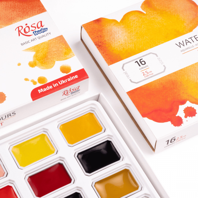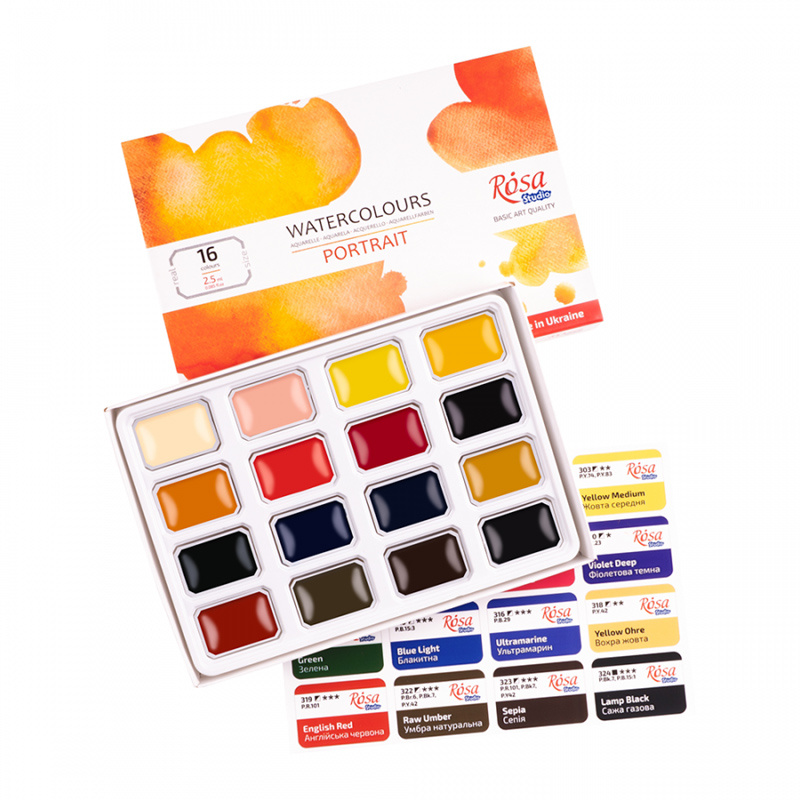 Akwarele Rosa Studio w zestawie portretowym, w formie wygodnych kostek. Zestaw zawiera wszystkie odcienie niezbędne do tworzenia studium portretu oraz odtwarzania karnacji i rysów twarzy oraz zapewnia maksymalną swobodę tworzenia złożonych i emocjonalnych portretów. Wysokiej jakości pigmenty pozwalają uzyskać wysokie nasycenie, czystość i transparentność barw. Naturalne roślinne spoiwo roślinne z zawartością gumy arabskiej pozwala osiągnąć na powierzchni doskonałą dyspersję kolorów. Większość farb w zestawie jest jednopigmentowa, co daje szerokie możliwości eksperymentowania z kolorami. Po wyschnięciu pozwalają uzyskać klasyczne matowe wykończenie.