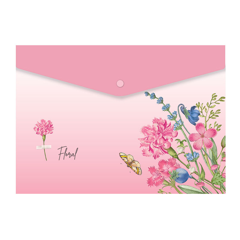 Teczki wykonane z tworzywa w formie kopert. Zamykane są na zatrzaski. Dostępne w czterech różnych wariantach graficznych z przepięknymi motywami kwiatowymi. Idealne do przechowywania notatek szkolnych lub innych dokumentów.