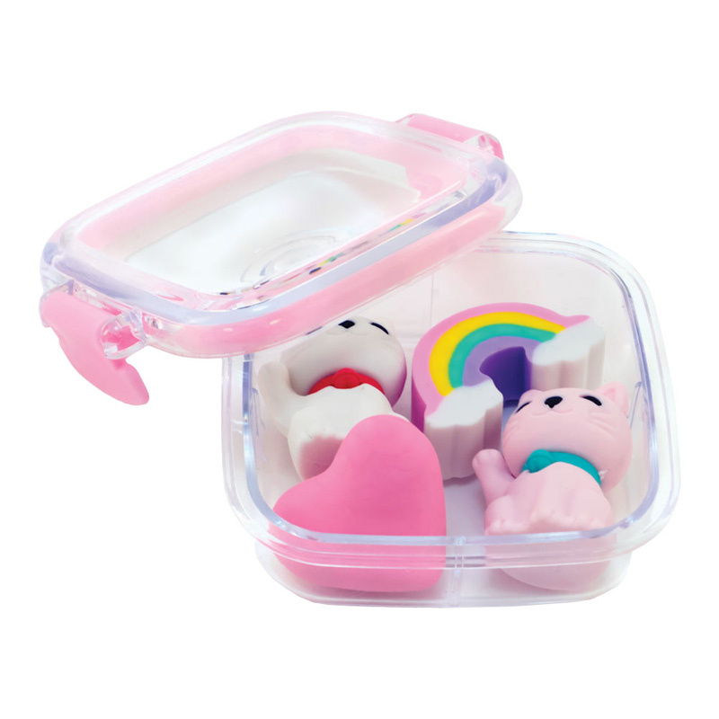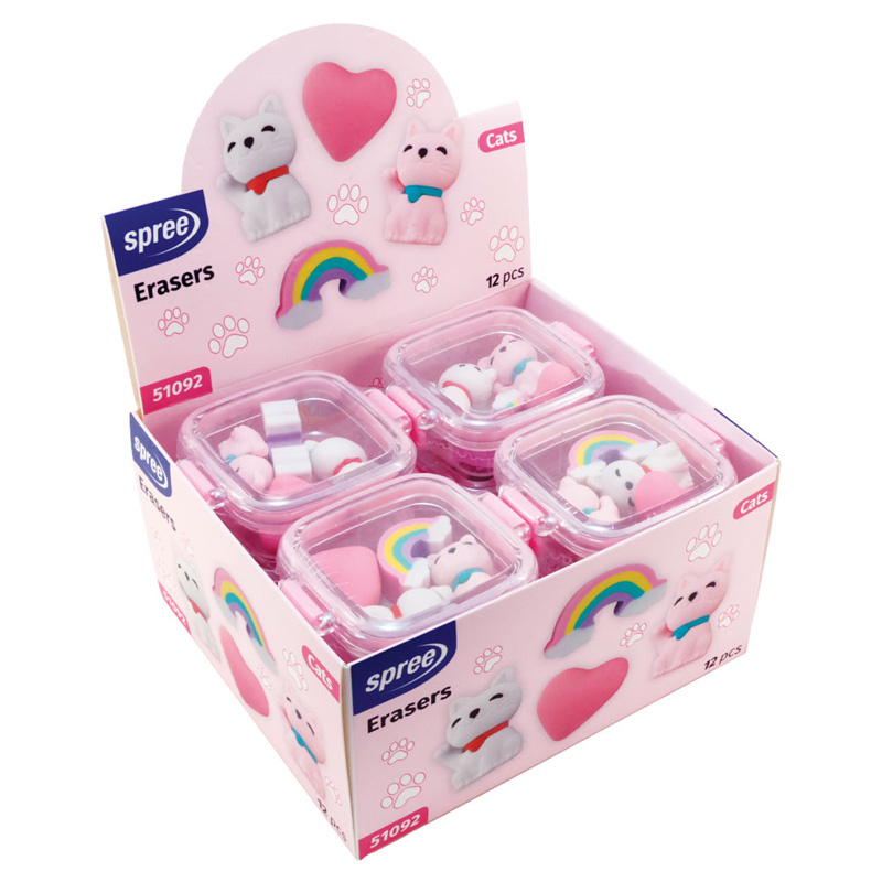 Zestaw gumek do wymazywania przeznaczony dla dziewczynek, zawierający gumki o atrakcyjnych kształtach, takich jak kotki, tęcza czy serduszko. Wykonane z miękkiego materiału, skutecznie usuwają ślady ołówka, nie uszkadzając przy tym powierzchni papieru. Idealne do codziennego użytku w szkole, na uczelni oraz w biurze. Całość zapakowana w praktyczne, plastikowe pudełko ułatwiające przechowywanie.