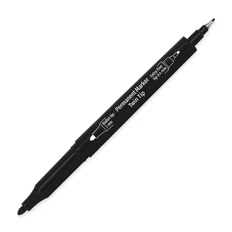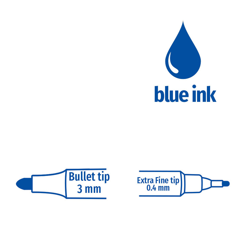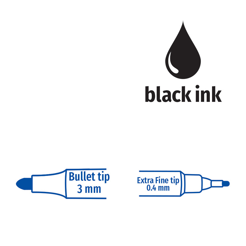 Markery permanentne, podwójne. Posiadają dwa rodzaje końcówek - końcówkę cienką o średnicy 0,4 mm, idealną do pisania oraz kreślenia konturów oraz końcówkę typu bullet o średnicy 3 mm, która posiada szerszy zakres działania i idealnie sprawdzi się przy wypełnianiu powierzchni, zakreślania tekstu lub stawiania grubych linii. Przeznaczone do używania na różnych powierzchniach takich jak plastik, metal, czy szkło. Do rysunku, pisania lub kolorowania. Posiadają permanentny tusz, który nie płowieje z czasem.
