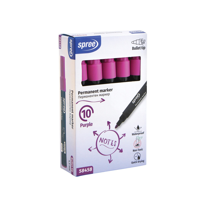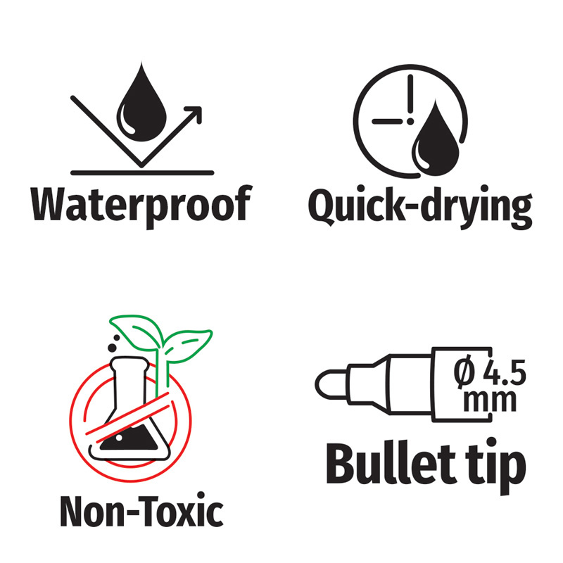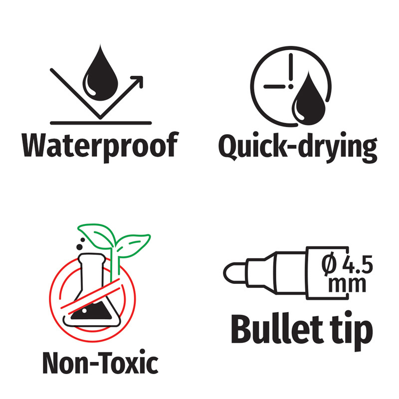 Markery permanentne z końcówkami typu bullet o średnicy 4,5 mm to niezawodne narzędzia do codziennego użytku. Dzięki szybkoschnącemu, wodoodpornemu tuszowi zapewniają trwałe i wyraźne oznaczenia na różnych powierzchniach. Formuła odporna na działanie światła sprawia, że napisy nie blakną z upływem czasu. Produkty są nietoksyczne, co zwiększa bezpieczeństwo użytkowania.