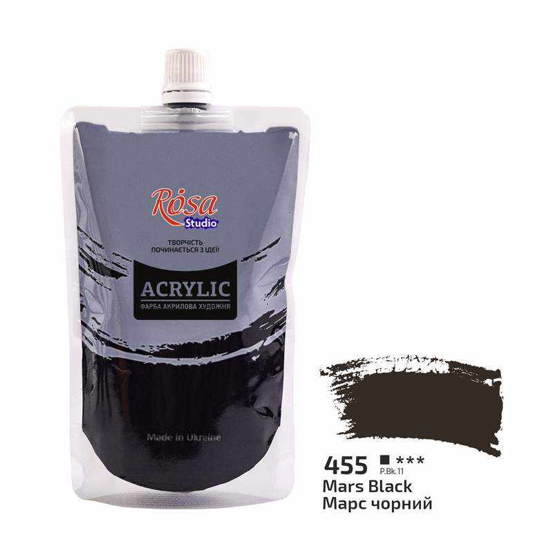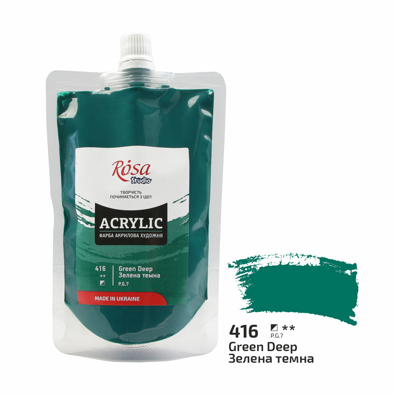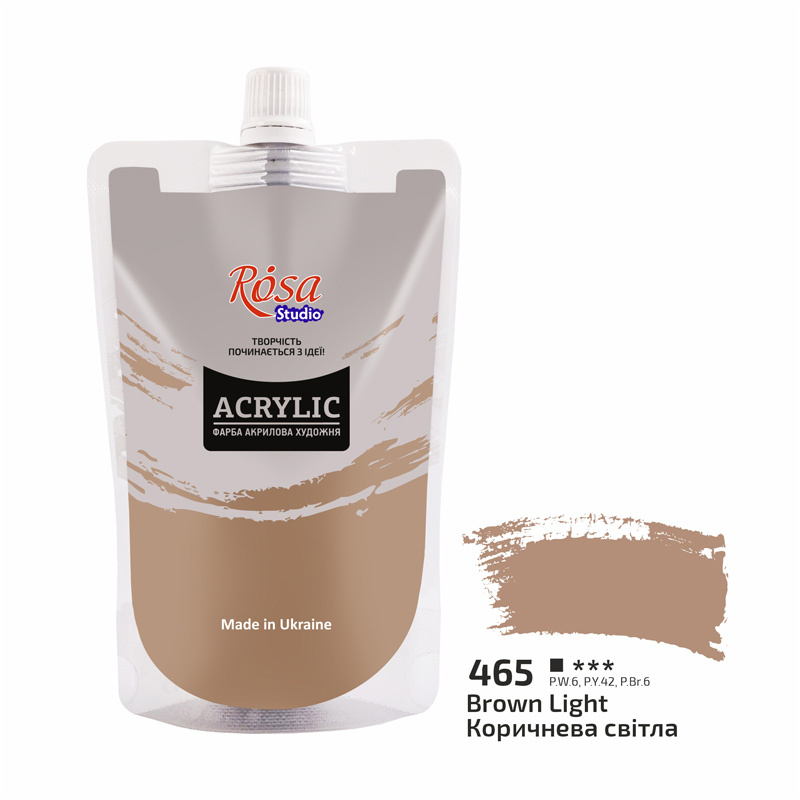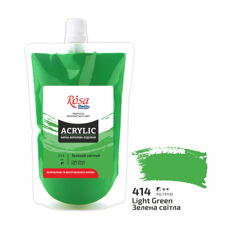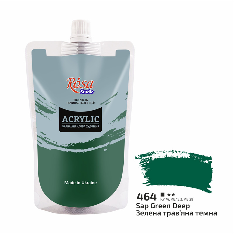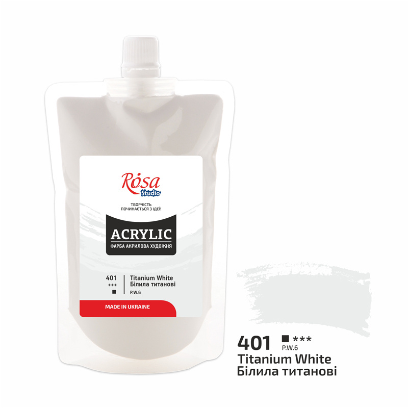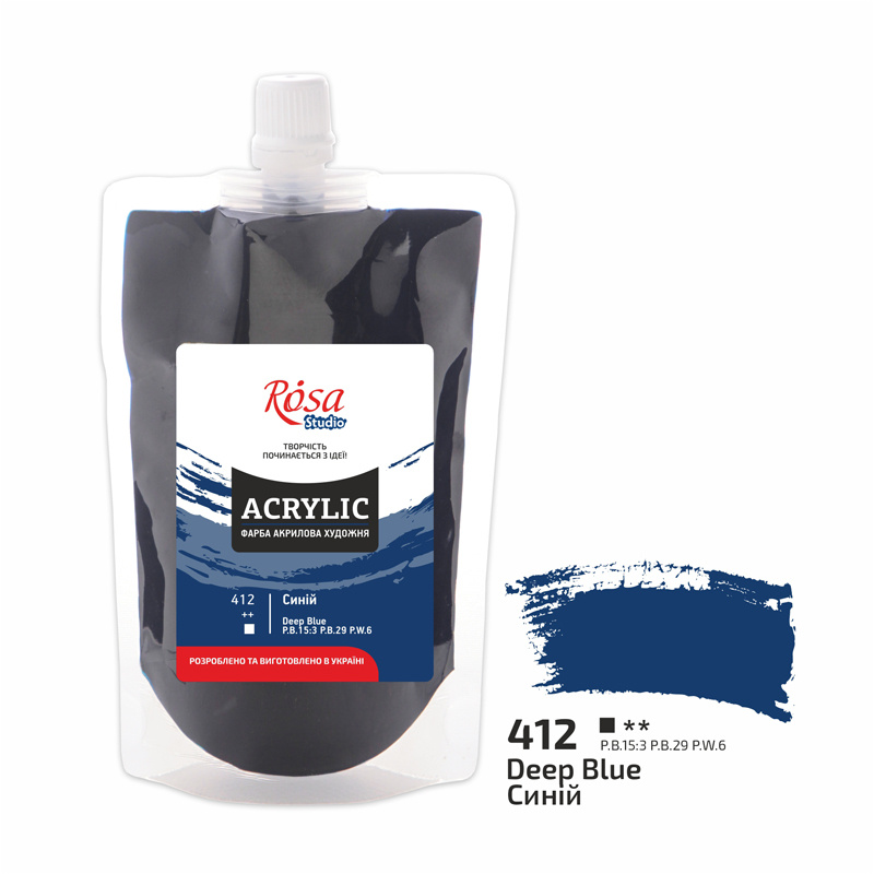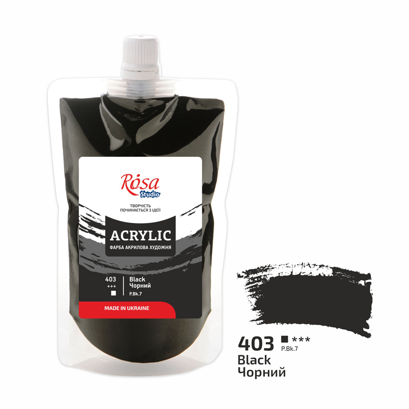 Farby akrylowe Rosa Studio w tubkach o pojemności 200 ml. Posiadają kremową, bardzo gęstą oraz jednolitą konsystencję, co ułatwia rozprowadzanie farb. Konsystencja farb jest jednorodna i niezależna od koloru; jest taka sama w całej palecie kolorystycznej. Farby cechują się niesamowicie wysoką pigmentacją i intensywnością kolorów. Bardzo dobrze rozprowadzają się na różnych powierzchniach, typu papier, kamień czy szkło. Świetnie mieszają się z innymi farbami i mediami. Są bardzo wydajne; niewielką ilością farby można zapełnić dużą powierzchnię. Po wyschnięciu posiadają delikatnie błyszczące powłoki i są elastyczne, co sprawia, że nie pękają z upływem czasu.