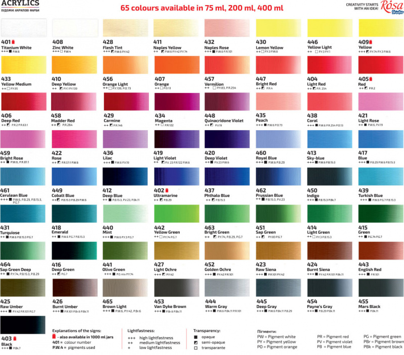 Farby akrylowe Rosa Studio w tubkach o pojemności 200 ml. Posiadają kremową, bardzo gęstą oraz jednolitą konsystencję, co ułatwia rozprowadzanie farb. Konsystencja farb jest jednorodna i niezależna od koloru; jest taka sama w całej palecie kolorystycznej. Farby cechują się niesamowicie wysoką pigmentacją i intensywnością kolorów. Bardzo dobrze rozprowadzają się na różnych powierzchniach, typu papier, kamień czy szkło. Świetnie mieszają się z innymi farbami i mediami. Są bardzo wydajne; niewielką ilością farby można zapełnić dużą powierzchnię. Po wyschnięciu posiadają delikatnie błyszczące powłoki i są elastyczne, co sprawia, że nie pękają z upływem czasu.