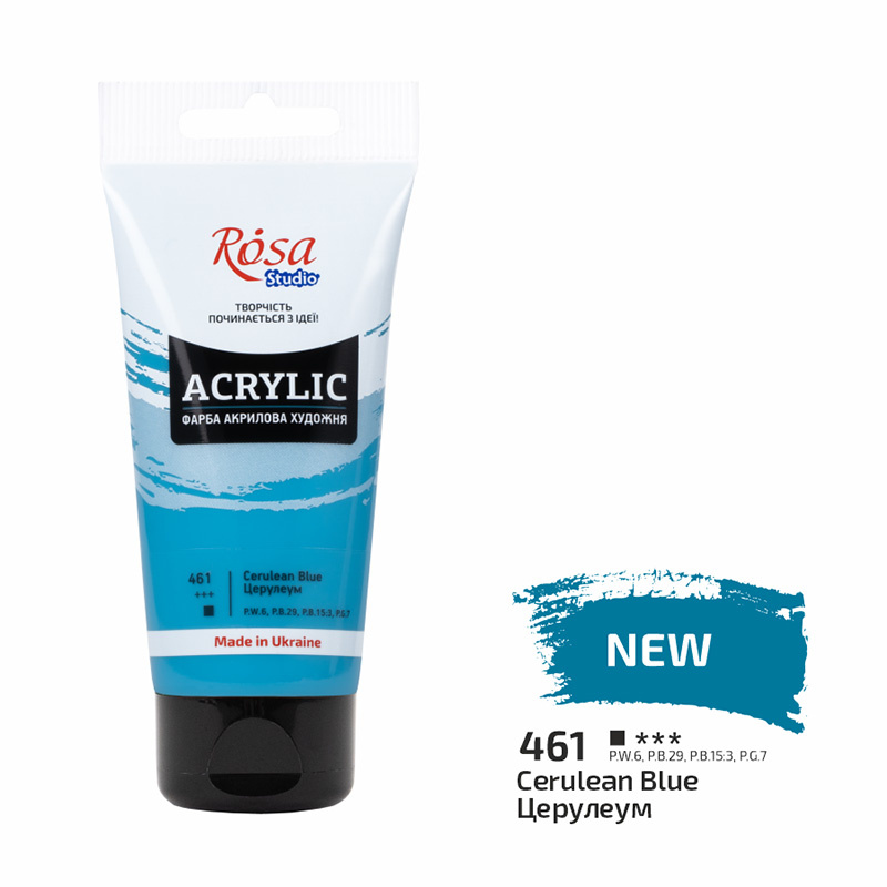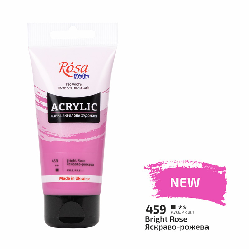 Farby akrylowe Rosa Studio w tubkach o pojemności 75 ml. Posiadają kremową, bardzo gęstą oraz jednolitą konsystencję, co ułatwia rozprowadzanie farb. Konsystencja farb jest jednorodna i niezależna od koloru; jest taka sama w całej palecie kolorystycznej. Farby cechują się niesamowicie wysoką pigmentacją i intensywnością kolorów. Bardzo dobrze rozprowadzają się na różnych powierzchniach, typu papier, kamień czy szkło. Świetnie mieszają się z innymi farbami i mediami. Są bardzo wydajne; niewielką ilością farby można zapełnić dużą powierzchnię. Po wyschnięciu posiadają delikatnie błyszczące powłoki i są elastyczne, co sprawia, że nie pękają z upływem czasu.