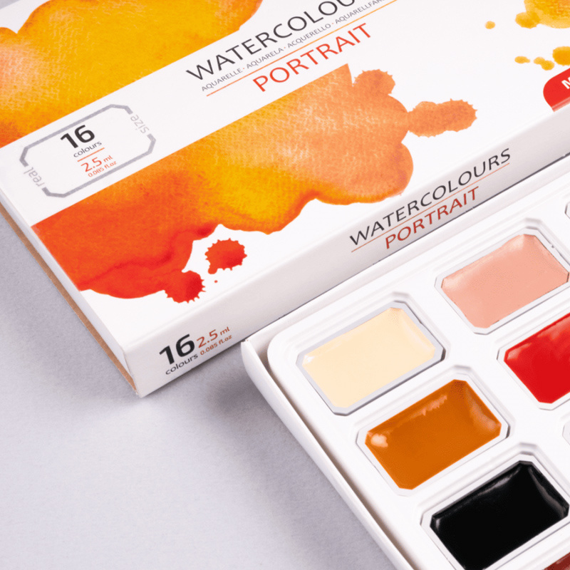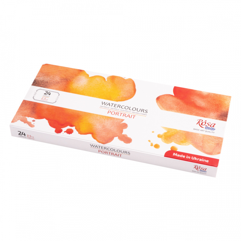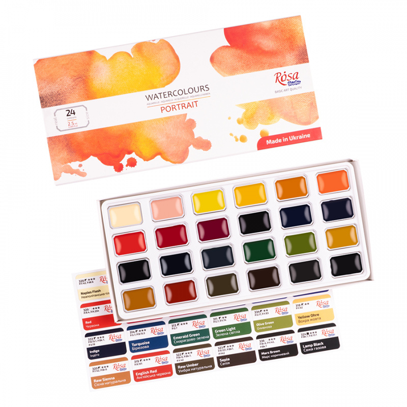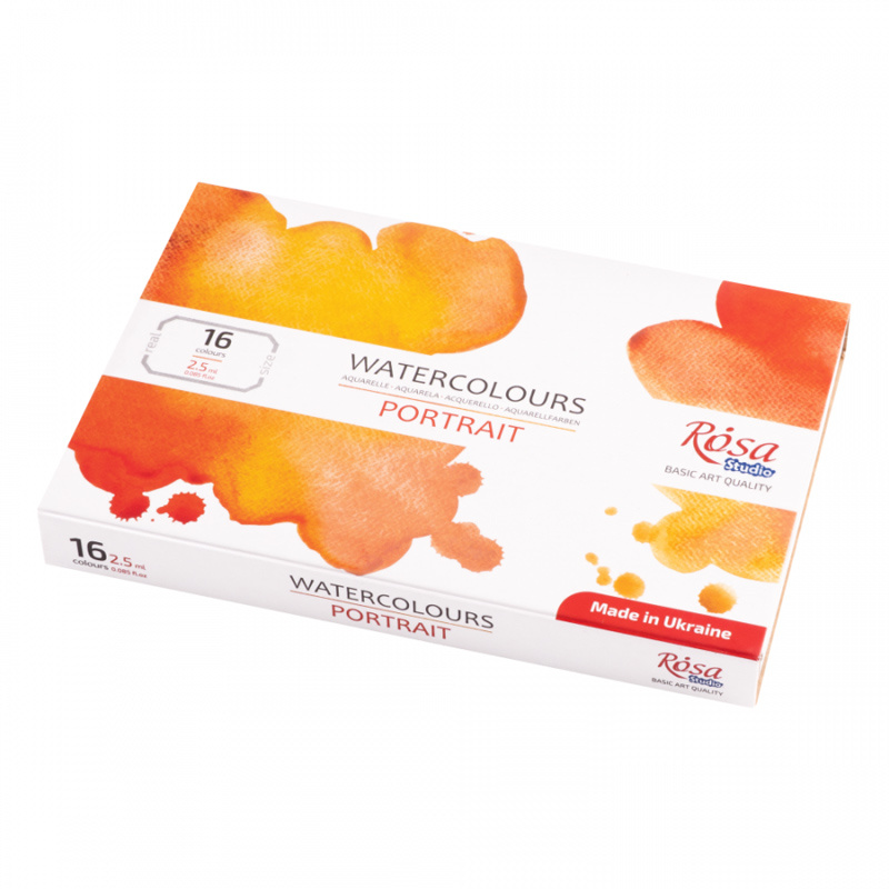 Akwarele Rosa Studio w zestawie portretowym, w formie wygodnych kostek. Zestaw zawiera wszystkie odcienie niezbędne do tworzenia studium portretu oraz odtwarzania karnacji i rysów twarzy oraz zapewnia maksymalną swobodę tworzenia złożonych i emocjonalnych portretów. Wysokiej jakości pigmenty pozwalają uzyskać wysokie nasycenie, czystość i transparentność barw. Naturalne roślinne spoiwo roślinne z zawartością gumy arabskiej pozwala osiągnąć na powierzchni doskonałą dyspersję kolorów. Większość farb w zestawie jest jednopigmentowa, co daje szerokie możliwości eksperymentowania z kolorami. Po wyschnięciu pozwalają uzyskać klasyczne matowe wykończenie.
