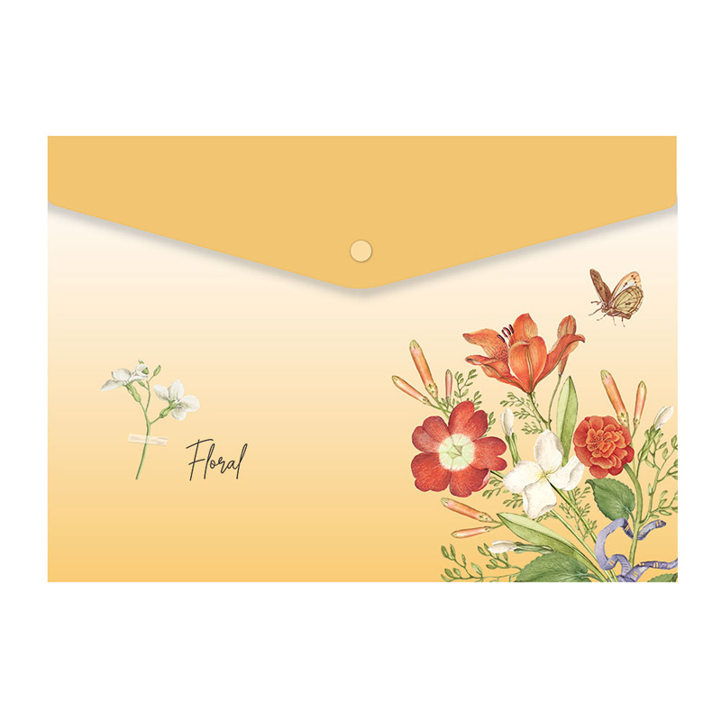 Teczki wykonane z tworzywa w formie kopert. Zamykane są na zatrzaski. Dostępne w czterech różnych wariantach graficznych z przepięknymi motywami kwiatowymi. Idealne do przechowywania notatek szkolnych lub innych dokumentów.