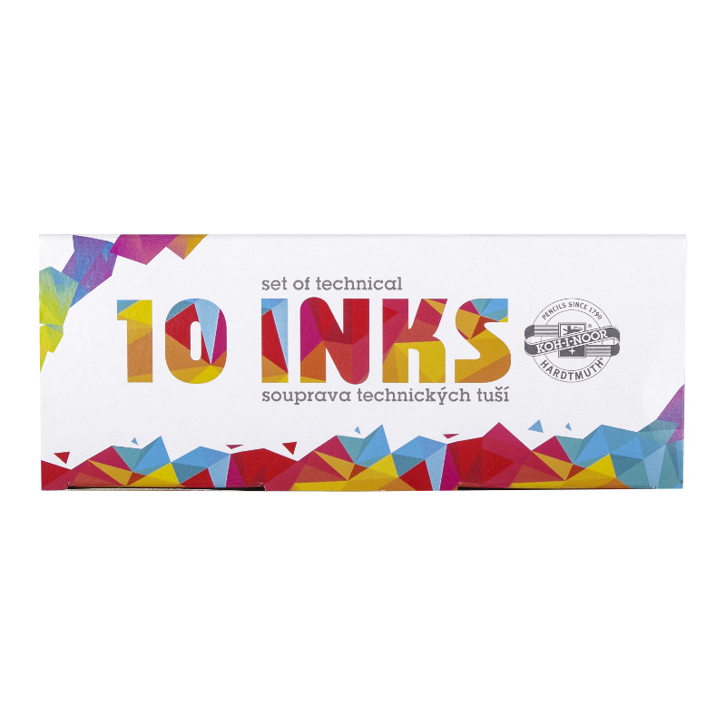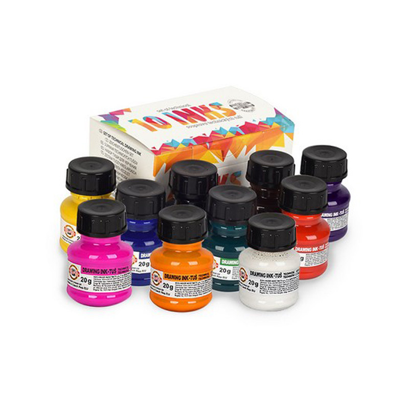Komplety tuszów kreślarskich w kartonowych opakowaniach. Dostępne w zestawach: 6 i 10 kolorów po 20 g każdy.